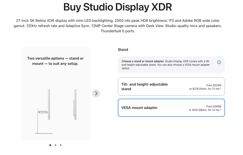 Bu fiyat güncellemesi ile cam seçeneği ikinci adıma taşındı. Artık ilk adım, 3299 dolarlık stand seçeneği veya 2899 dolarlık VESA montaj adaptörü seçeneği arasında seçim yapmaktır. Bu, en düşük giriş fiyatı yapılandırmasının hemen gösterilmesini sağlıyor.