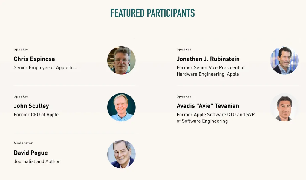 Eski Apple CEO'su John Sculley de bu akşamki panelde yer alacak. Ayrıca, Apple’a 1976 yılında katılan ve şirketin en uzun süreli çalışanı olan Kıdemli Çalışan Chris Espinosa, panelde uzaktan katılacak olan eski Donanım Mühendisliği Kıdemli Başkan Yardımcısı Jon Rubinstein ve 2006 yılında Apple'dan ayrılan, Yazılım Teknolojisi Kıdemli Başkan Yardımcısı Avadis “Avie” Tenevian da bulunacak.