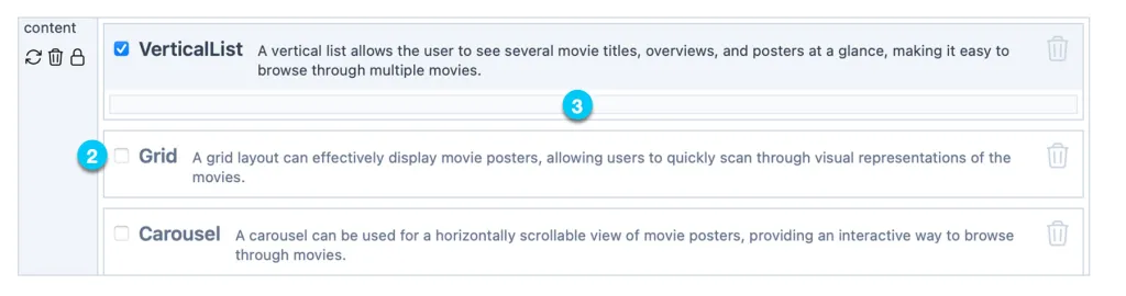 Bu yapı ayrıca henüz tanımlanmamış parçalar için yer tutucular (örneğin, bir buton etiketi, bir resim veya bir içerik bölümü) ve birden fazla olası UI alternatifi içerebilir. Örneğin, aynı içeriği bir liste veya bir ızgara olarak temsil edebilir.