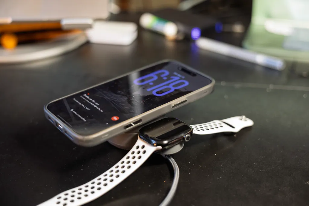 Apple Watch şarj cihazı içerden katlanarak çıkıyor ve üç farklı açıda durabiliyor – tamamen düz de dahil. Yan yana bir kurulum istiyorsanız bu oldukça hoş. Ayrıca, düşük yüksekliğiyle StandBy için de harika.