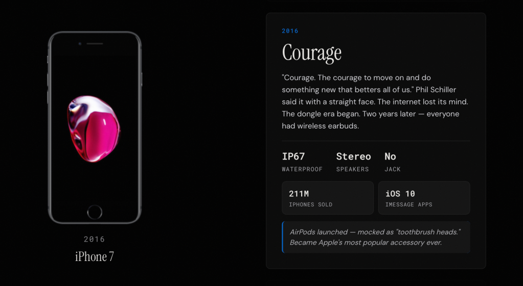 Bir ilginç etkileşimli grafik, temel ve en pahalı modellerin yıllara göre fiyat evrimini gösterirken, ardından Apple'ın yıllar içinde kaldırdığı donanım özelliklerini listeleyen "Mezar" bölümü geliyor. Bu özellikler arasında 30-pin konektör, kulaklık girişi ve 3D Touch yer alıyor.