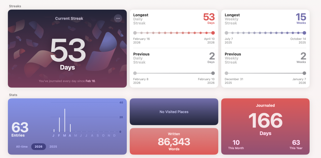 Mac'te Journal uygulamasını gerçekten kullanmaya başladığımdan beri, 166 günde 86.000'den fazla kelime kaydettim.