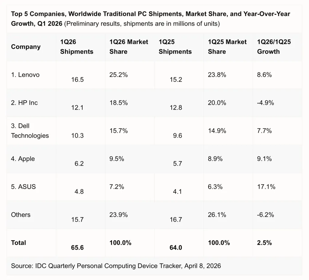 Yine de, Apple ve ASUS, IDC'nin dünya genelindeki geleneksel PC sevkiyatlarında dördüncü ve beşinci sırada yer aldı; Lenovo, HP ve Dell'in arkasında.