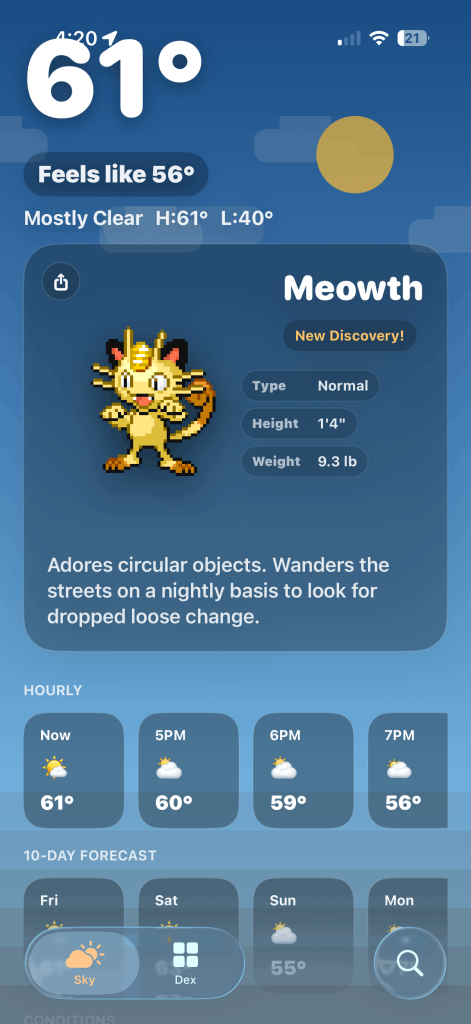 Özetlemek gerekirse, bu uygulama, herkesin zaten kullandığı sıkıcı bir yardımcı uygulamaya heyecan katıyor. Birkaç gün kullandıktan sonra, benim için Apple Hava Durumu uygulamasının yerini tamamen aldı. Ana ekranımda hava durumunu ve en son Pokémon karşılaşmamı gösteren orta boy bir widget var, bu harika.