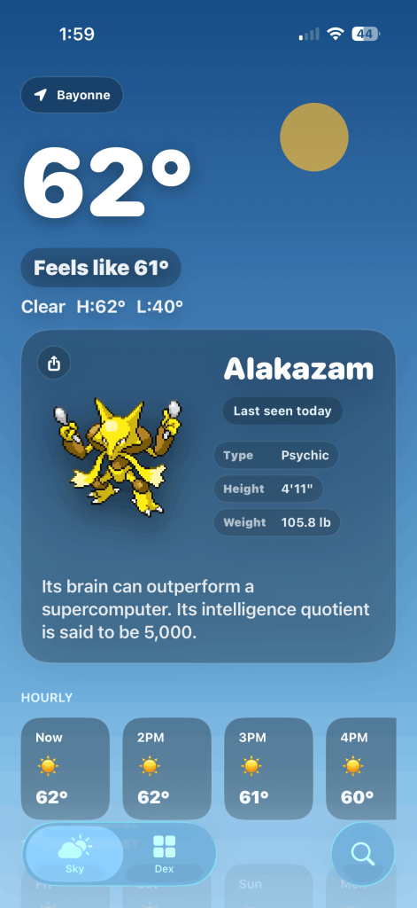 Hayatım boyunca bir Pokémon hayranı oldum. 6 yaşındayken babamla birlikte Best Buy'a gidip ilk Pokémon oyunu olan Pokémon Blue'u aldığım günü hala hatırlıyorum. Hemen bağımlısı oldum. Tüm oyunları oynayarak, diziyi izleyerek büyüdüm ve hâlâ kartları topluyorum. Bu yüzden, Pokémon'u günlük yaşamla harmanlayan yeni bir şey çıktığında hemen ilgimi çekiyor. Twitter'da SkyDex'i gördüğümde, günlük hava tahmininizi bir Pokémon keşif deneyimine dönüştüren bir hava durumu uygulaması, hemen indirmem gerekti. Biraz kullandıktan sonra, sizin de denemeniz gerektiğini düşünüyorum. İşte nedenleri.