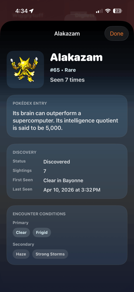 Üstelik, karşılaşmalarınızda bir nadirlik de var. Pokémonlar ya yaygın, ya nadir, ya da efsanevi. Yani, eğer bölgemde açık bir günse, bir Meowth bulma şansım yüksek, ama aynı zamanda nadir bir şey bulma şansım da var, örneğin bir Alakazam. Bu, biraz öngörülemezlik katıyor ve her kontrolü daha ödüllendirici hale getiriyor. Sonunda, bu Pokémonlarla karşılaşmaya başladığınızda, bunlar Dex'inize ekleniyor. Dex'inize eklendikten sonra, onların bilgilerini, ne zaman ve nerede keşfettiğinizi görebiliyor ve hatta Pokémon'un "çığlığını" (nasıl ses çıkardıklarını) dinleyebiliyorsunuz.